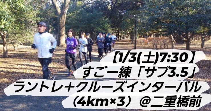 - 【1/3(土)7:30】すごー練「サブ3.5」ラントレ+クルーズインターバル(4km×3)@二重橋前 :