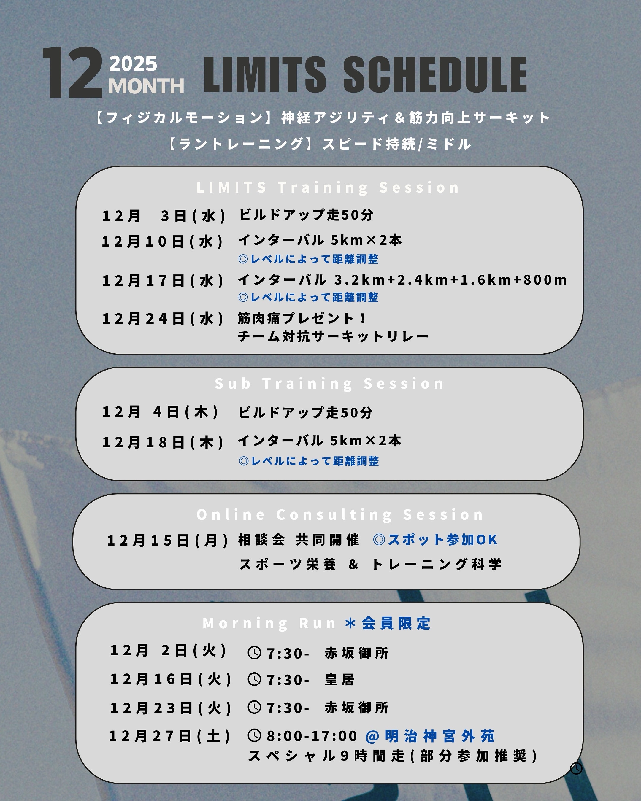 【LIMITS|身体能力開発ランクラブ】12月練習会(インターバル:サブ2:40-5:00) 受付中