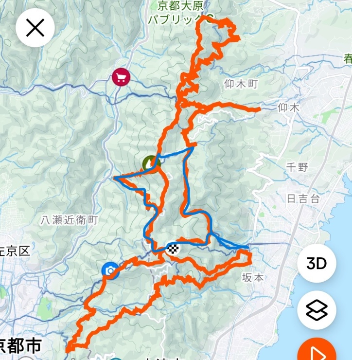 ・最初にレース最後の激坂を登り延暦寺に行きます。(レース48km~50km)その後、コースを迂回して大比叡を通ります。青龍寺を下って横高山を登り返し(レース17~24km)横川中堂までエスケープ、その後横川林道を下って(レース44~47.5km)ケーブル坂本駅まで戻ります。