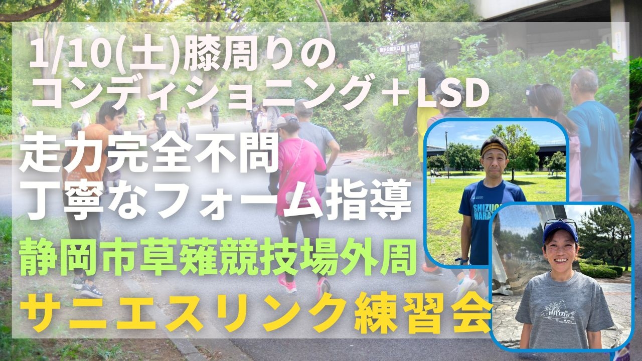 関東ですでに実績のある走力完全不問のランニングクラブ、サニエスリンクです。安心の練習システム、身体の仕組みをうまく使った専門的なストレッチやエクササイズ、丁寧なフォーム指導に定評があります。今まで関東エリアをメインに練習会を運営していましたが、2025年9月より、静岡市草薙陸上競技場外周でも練習会を新規スタートしました!ぜひご参加ください!