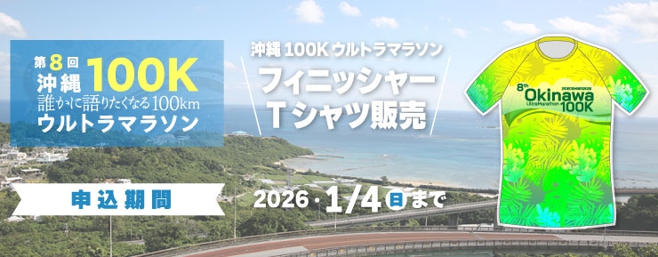 2025年12月21日(日)開催『第8回沖縄100Kウルトラマラソン』のフィニッシャーTシャツ販売ページです。