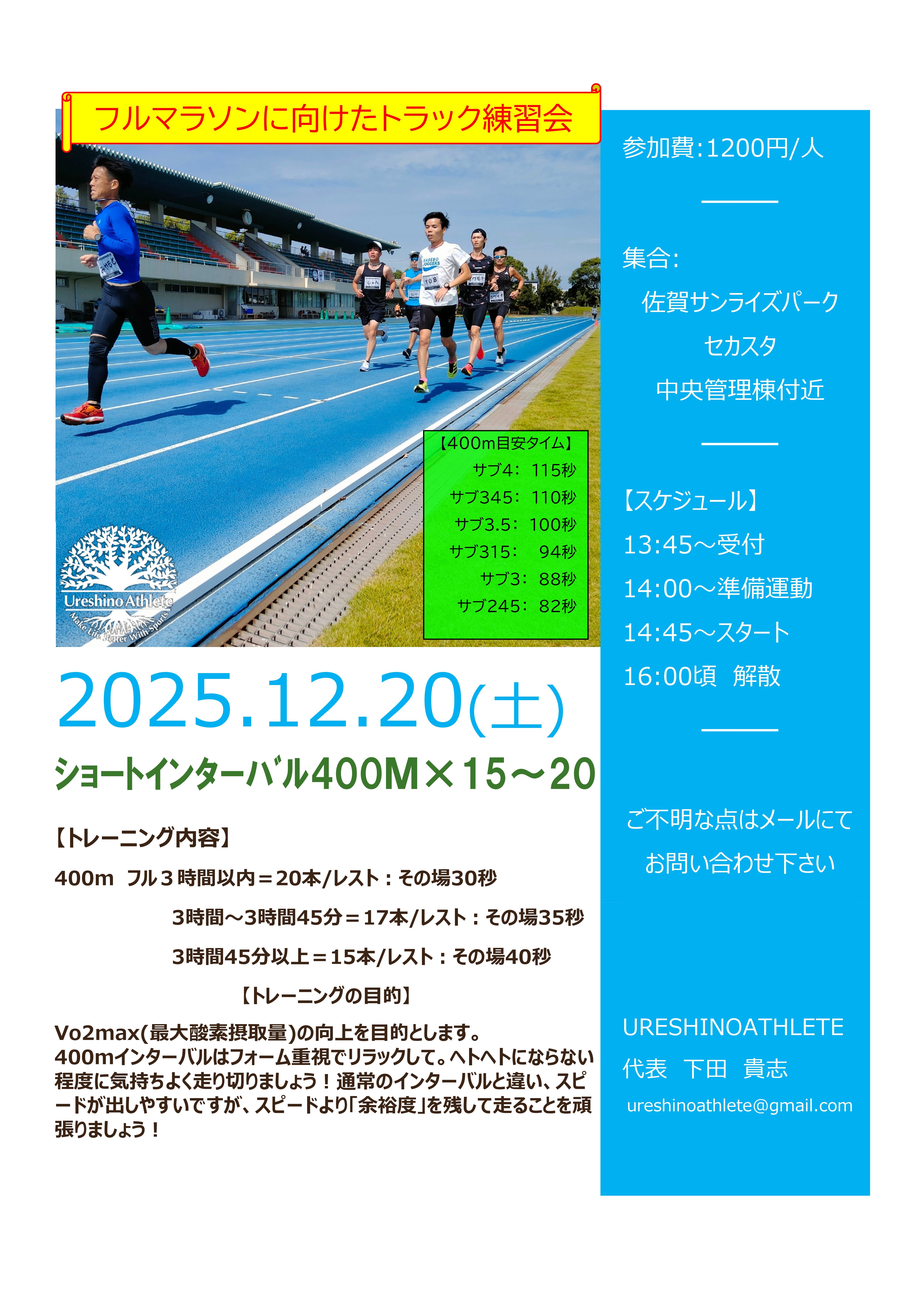 【スピード持久力強化!】ショートインターバル400m×15~20本 受付中