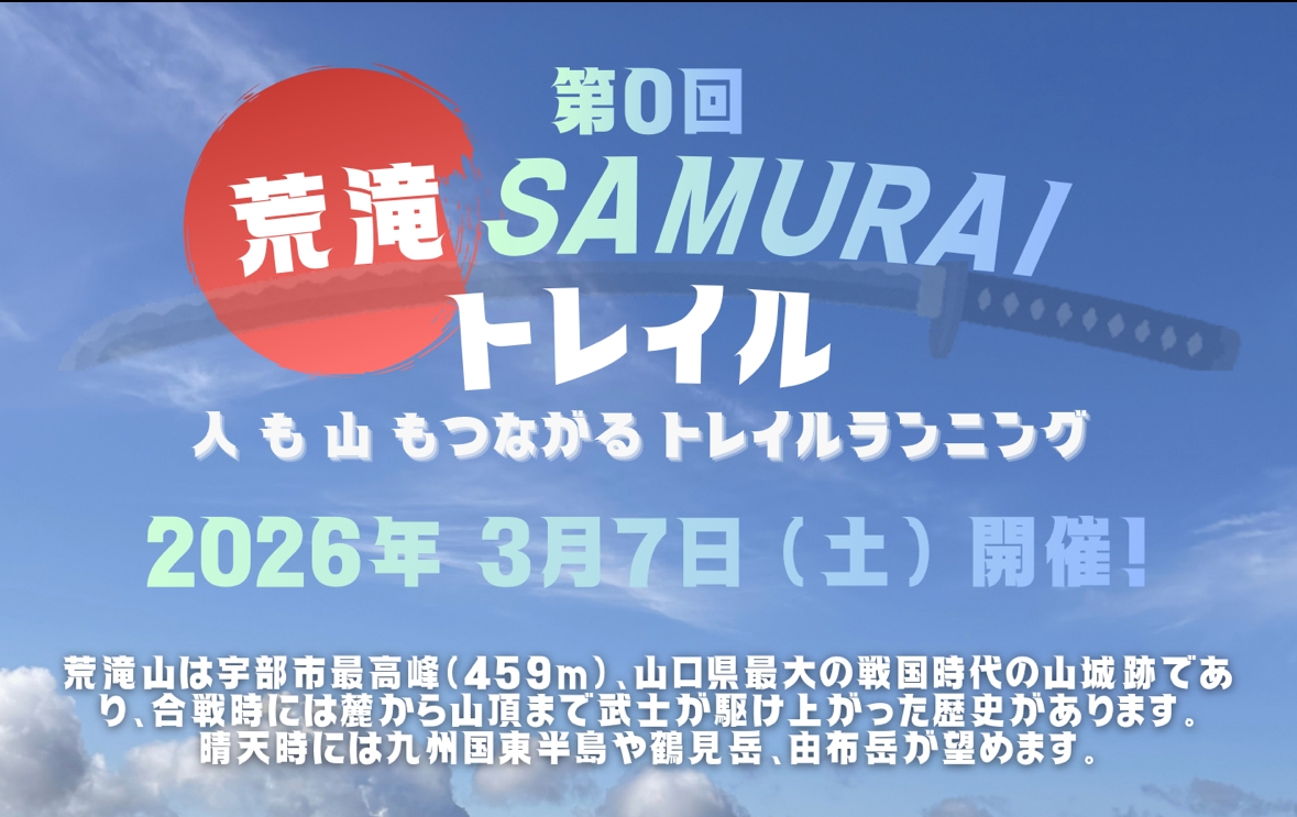 荒滝山は、宇部市北部に位置する市内最高峰で、山頂からは360度の絶景が広がり、晴れた日には九州や由布岳まで望めます。山頂付近には戦国時代の山城跡が残り、地元の防衛の要所として利用されていたことからも、自然と歴史が息づく地域です。トレイルランニングを通じて、自然保護と健康促進を目的に、地域とのつながりを深める大会を目指します。