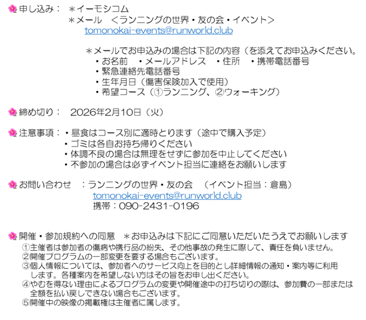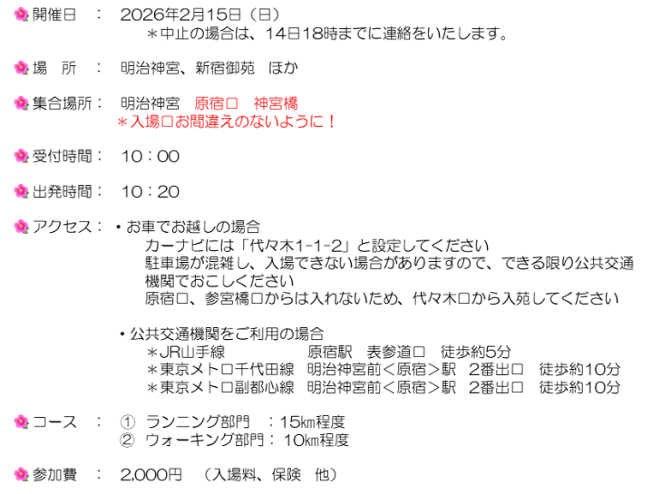 2月になり香りと共に春の訪れを知らせてくれる梅の花を観に行くマラニックです。主に明治神宮や新宿御苑を巡ります。新宿御苑は都心でありながら広大な敷地で、梅以外にも寒桜類や福寿草なども咲き、水辺では鳥たちにも出会える楽しい庭園です!春の訪れを一緒に探しに行きましょう!