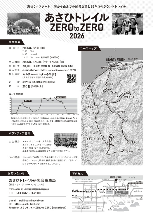 海抜0mのヒスイ海岸をスタート・ゴール地点とし、平安~戦国時代の武将たちが戦を交えた山城跡を巡り、ふかふかの里山トレイルを走り抜ける『あさひトレイル ZERO to ZERO 2026』へぜひご参加ください!