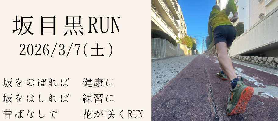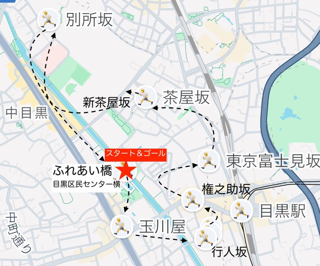 目黒駅前地域の坂を登り降りしながら、坂の歴史や由来を共有するランニングイベント。名所の坂等をランニングでめぐりつつ、名所の由来をスタッフが説明し進行。コース途中では地元和菓子店や寺院に立ち寄り昔の様子を聞く機会あり。約6キロ。所要約1時間40分コース。初心者歓迎。