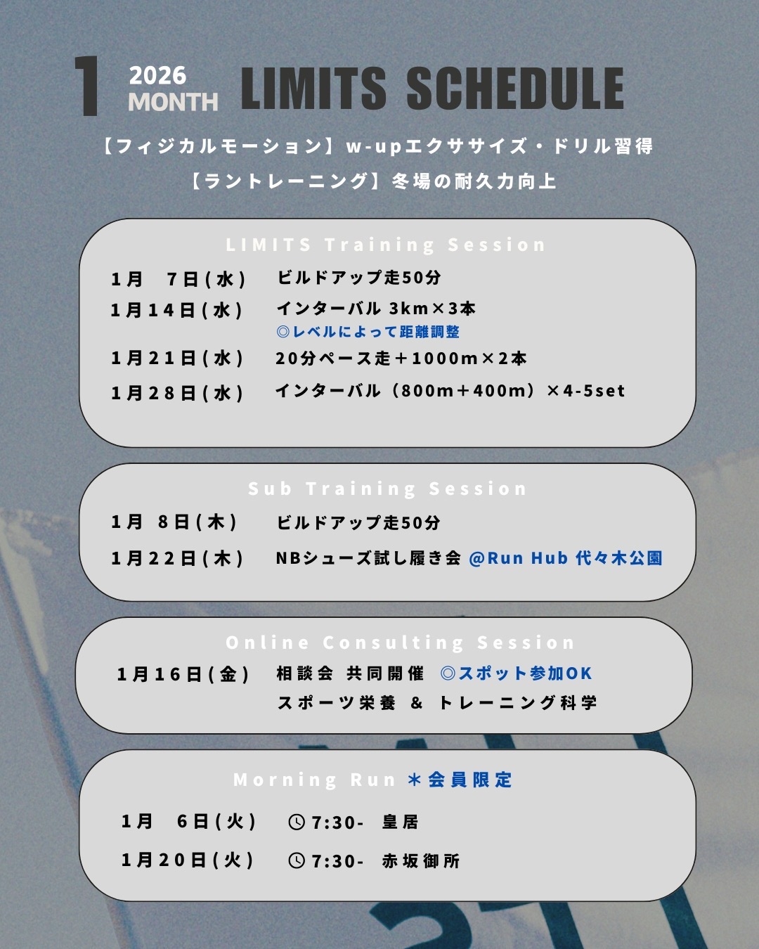 【LIMITS|身体能力開発ランクラブ】1月練習会(インターバル:サブ2:40-5:00) 受付中