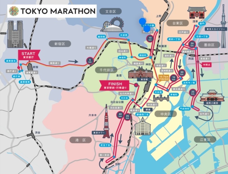 都庁前をスタートし、市ヶ谷・飯田橋→神保町→日本橋→門前仲町(折返しエリア)→銀座→日比谷→東京駅前ゴールと、東京マラソンコースをダイジェストで巡ります。疲れたら、途中で電車に乗って帰っても大丈夫ですよ。まずはチャレンジしてみましょう!