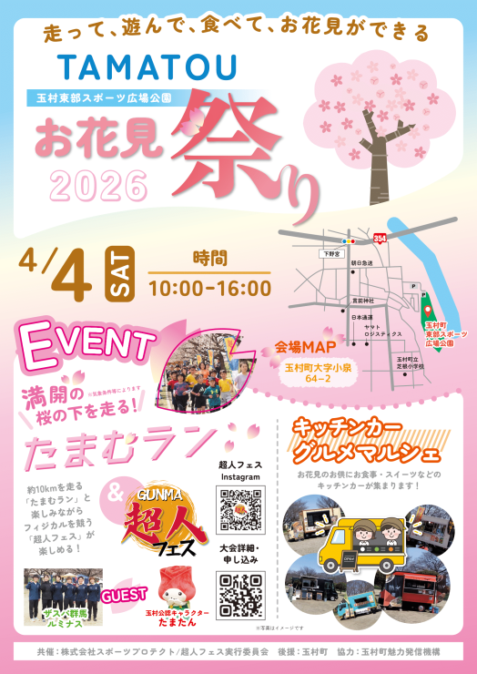 走った後は参加賞の地元産イチゴとおいしいグルメでお花見を楽しみましょう。