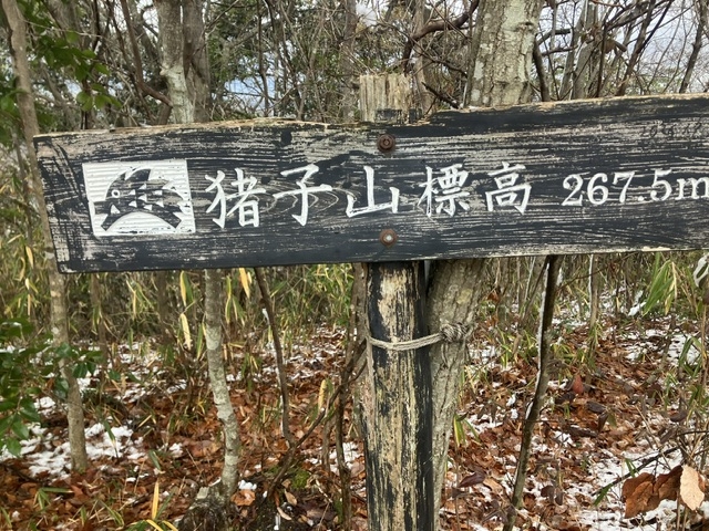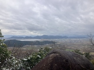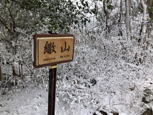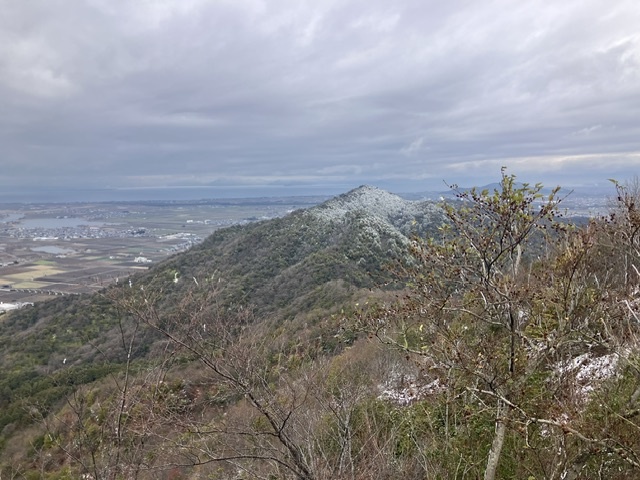 繖山へ向かう途中来た道を振り返ると、伊庭山が薄ら雪化粧。