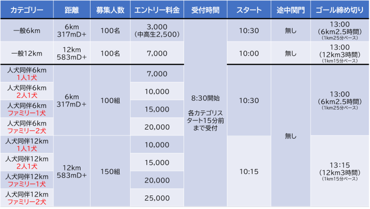 愛犬とともに走る12kmの旅を是非!担いでもOKです。もちろん一般の部も開催です!本年度から6Kも新設!コースは登って下りるだけですがイベント会場やすれ違いでお楽しみいただけます。
