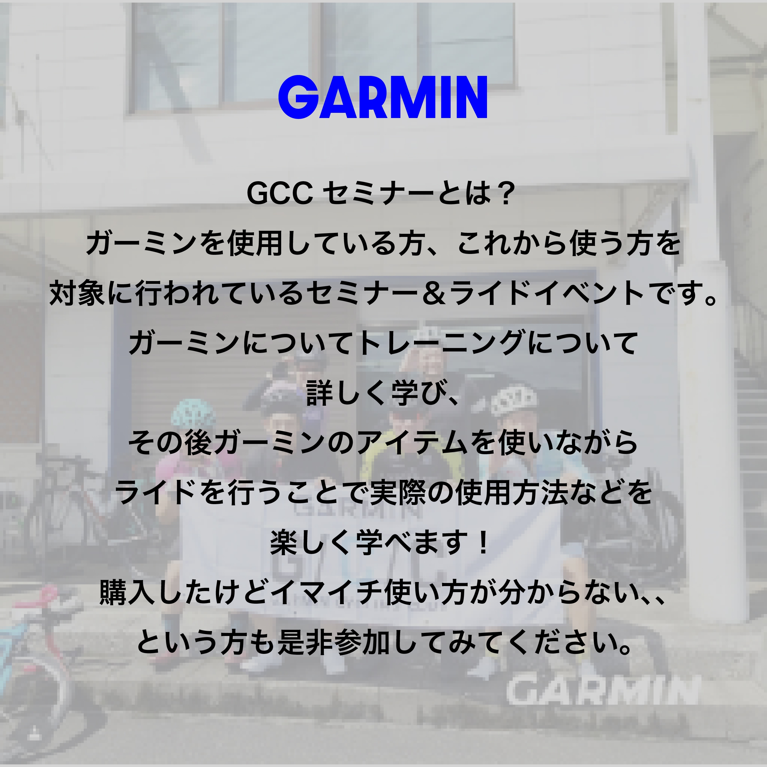 サイクルデバイスでも有名な「Garmin」のアイテムを使用した座学+ライドイベントになります!