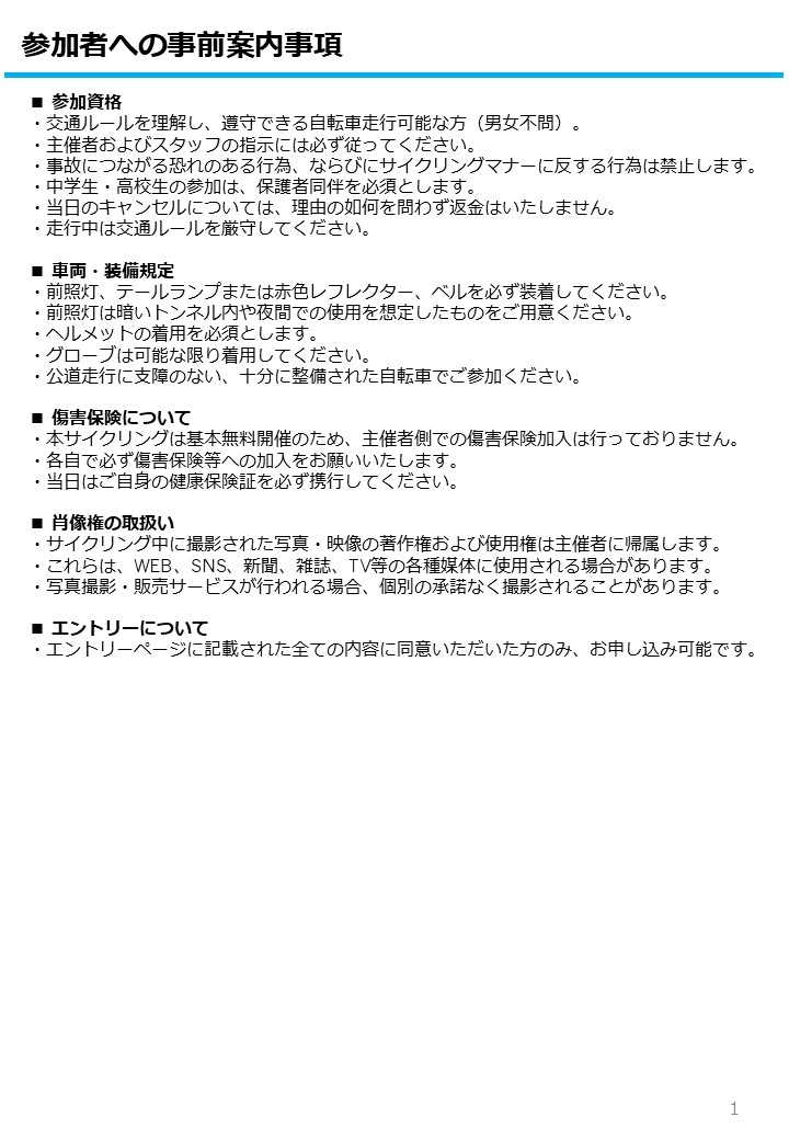 参加資格:紳士淑女で社会ルールを守れる方かつ 全て自己責任を了承できる方及び自転車保険又は該当する保険加入の方