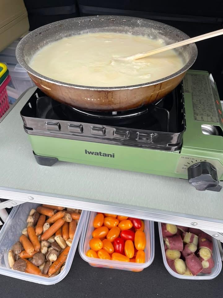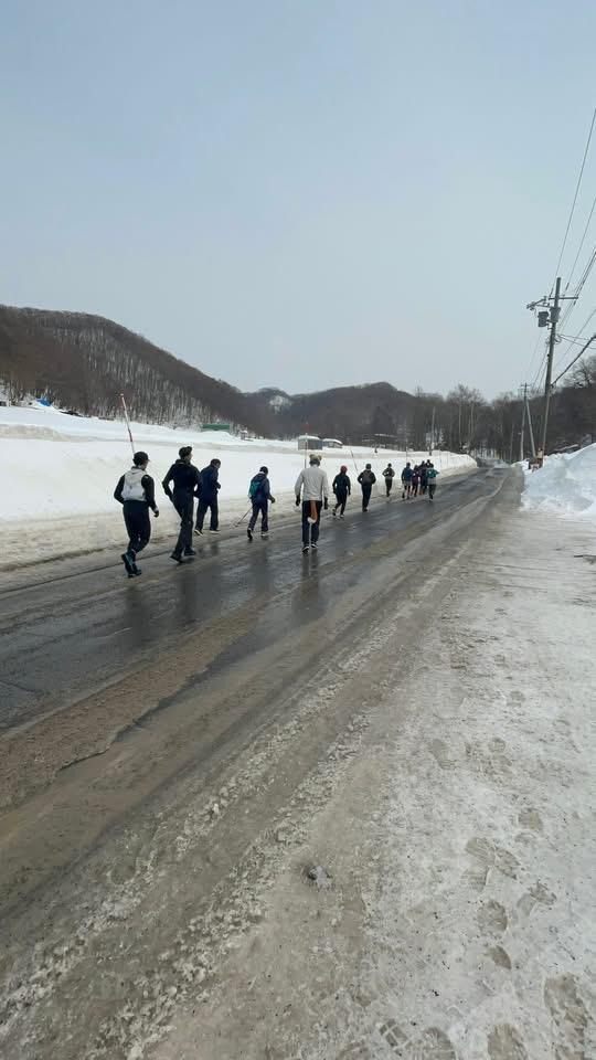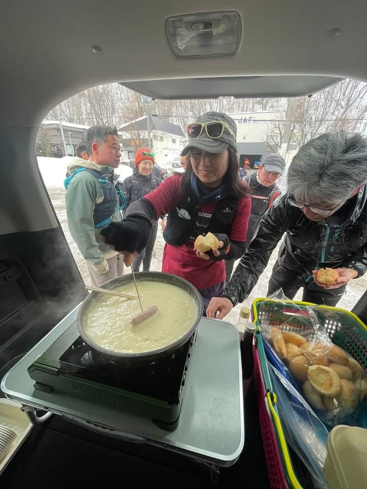 中盤からは最高気温6℃のゆきどけ路面でザクザクのベシャベシャ。なかなかタフな17キロでしたが、エイドでは手作りのチョコムースケーキ。車内でチーズフォンデュ。残った具材はスライストマトを乗せてグリル焼き。喜んでくれてました(*´∇`*)