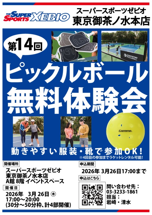 3月26日(木)17:00~20:00、スーパースポーツゼビオ東京御茶ノ水本店にてピックルボール無料体験会を開催します。