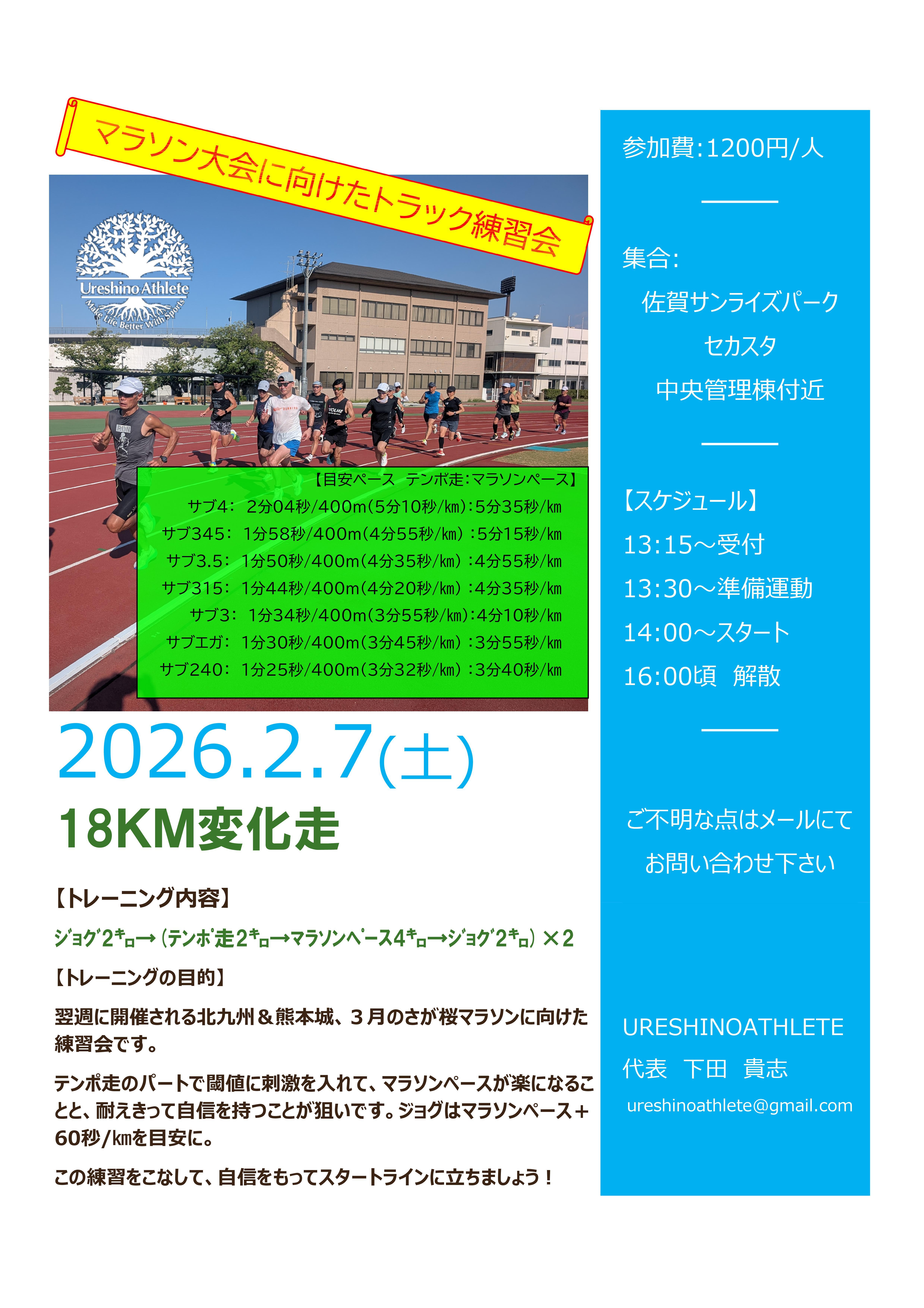 翌週に開催される北九&熊本城、3月のさが桜に向けたフルマラソン練習です。テンポ走ペースで閾値に刺激をいれつつ、テンポペース後のマラソンペースでリカバリーすることで、マラソンペースがイージーペースに感じれるようにする練習です。テンポペースで粘り倒して、マラソンペースでリカバリーしつつ、ジョグで一休みするイメージで走りましょう!自信をつけてスタートラインに立つための練習です!