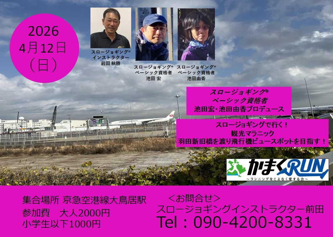 羽田空港周辺には、飛行機がよく見えて楽しく遊べる公園やスポットがたくさんあります。地元に住む「スロージョギング・ベーシック資格者」が案内します。上り坂はウォーキングで平坦な道はスロージョギングで巡ります。