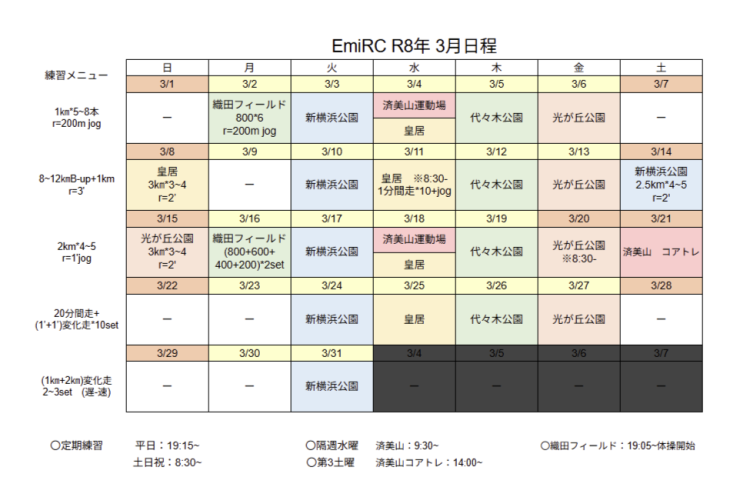 - 3/14(土) 2.5㎞*4~5本 r=2’ 動き作り・相談会有り :