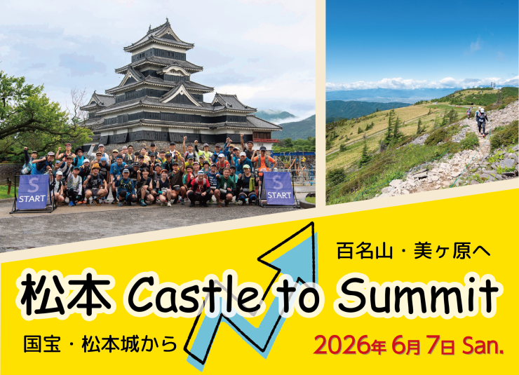 | スケジュール | 04:30 受付:松本神社(~05:30) 05:45 競技説明 06:00 スタート:松本城公園 07:30 エイド・関門1:松本市入山辺地区福祉ひろば 09:00 エイド・関門2:桜清水CAMP&GLAMPING 11:00 フィニッシュ制限:王ヶ頭 *バス停まで約15分 11:15 バス:自然保護センター発 松本駅行 13:00 フィニッシュチェック制限:松本神社 |