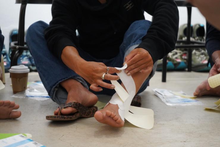 New-HALEテーピングを活用して筋膜を緩め、筋肉や関節の可動域を広めたり固めたりすることで怪我の予防につなげる為の貼り方を実践する講座です。後半では足底腱膜炎や外反母趾、シンスプリントなど個別のご質問にも可能な限りお答えいたします。