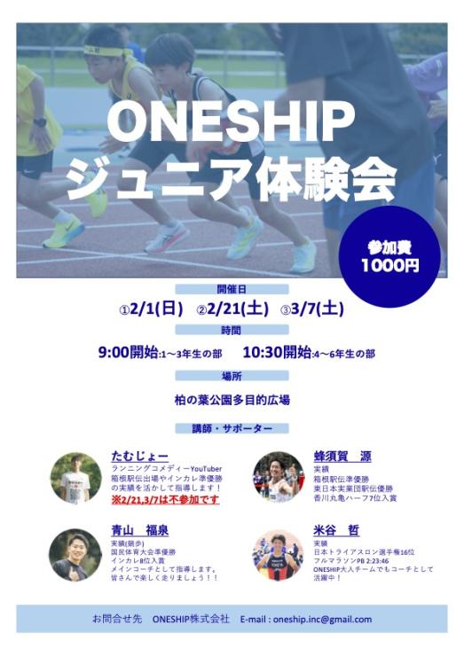 本イベントは箱根駅伝出場ランナー・たむじょー監修のもと企画された「ONESHIPジュニアランニングスクール」の体験会です。