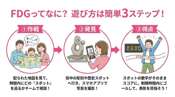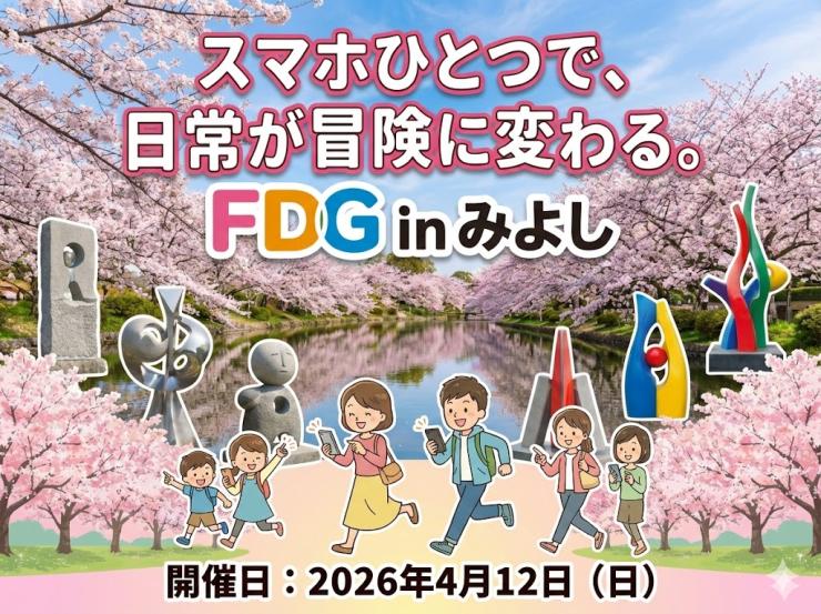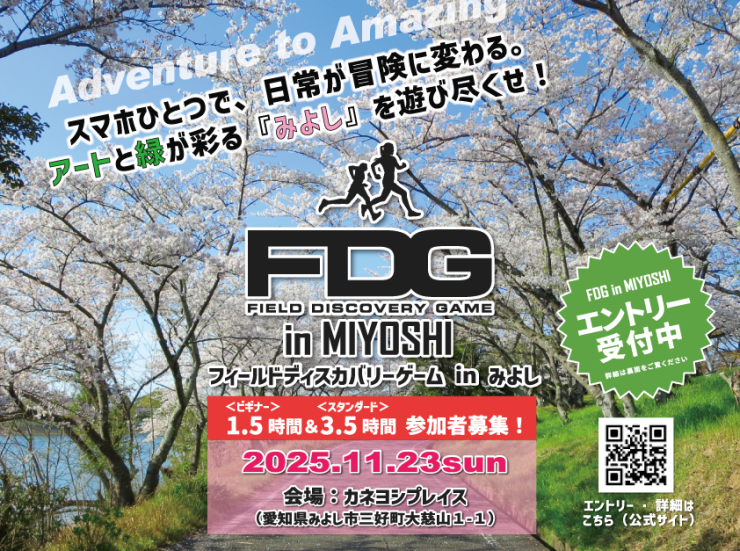 FDGはスマホアプリを使い、歴史文化遺産に設定されたスポットを巡り、制限時間内に得られたスコアで順位を競うロゲイニング形式の「アウトドアeスポーツ」です。みよし市内全域をフィールドに、スマホで街の「発見」を楽しむ新感覚ロゲイニング。三好池などの豊かな自然や、街中に点在する彫刻アート、由緒ある寺社を巡り、制限時間内に得られた得点を競います。地域の魅力を再発見する冒険へ、仲間と一緒に飛び出そう!!