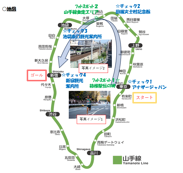 有楽町駅から新宿駅までを北回りで駅ごとに回るコースで、約22キロです。