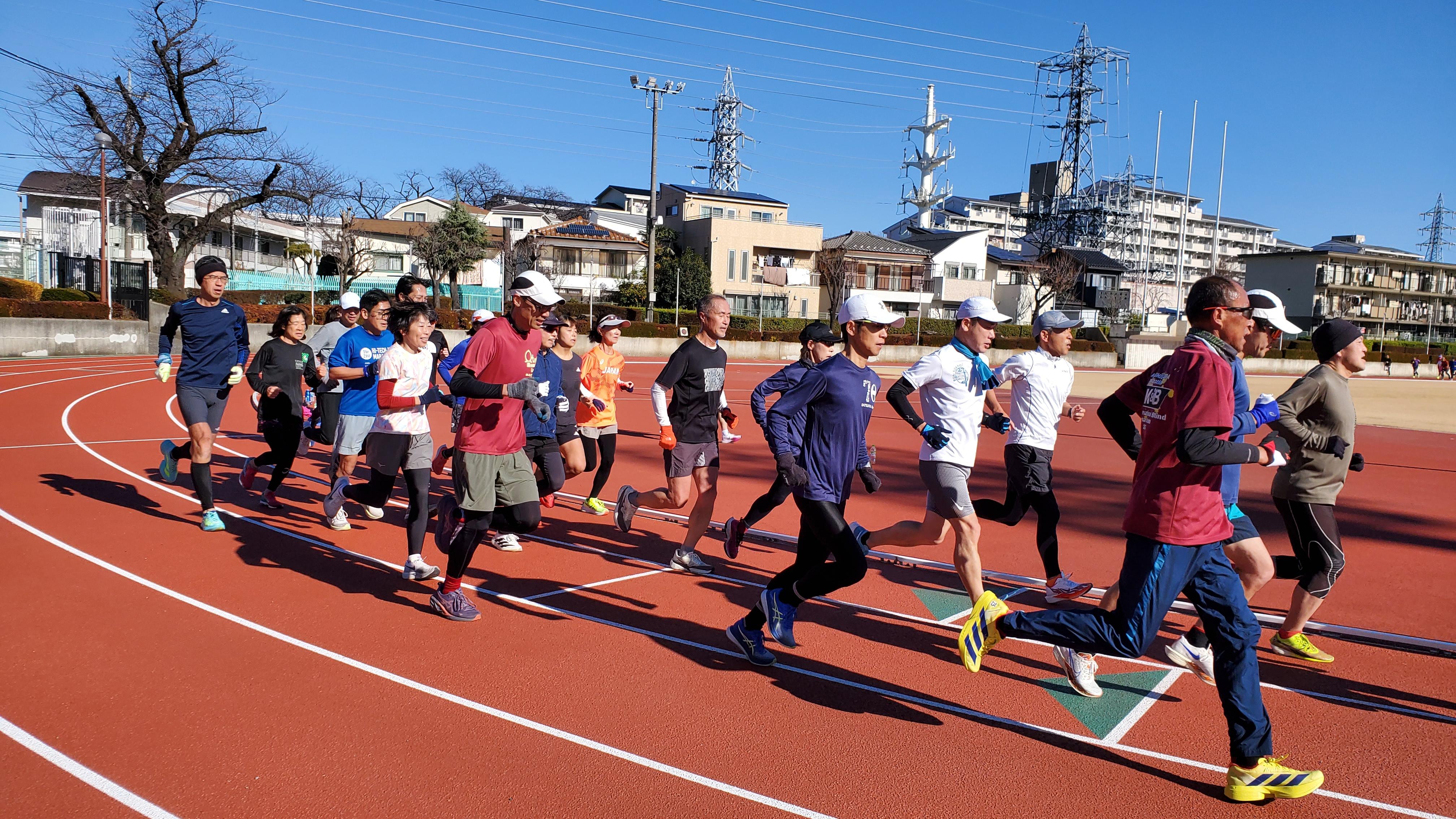 貸し切りの競技場で、気持ちよくインターバル走を楽しみます!次のレースでの快走のために一緒に頑張りたいと思っています。本数を減らしてもOKです!