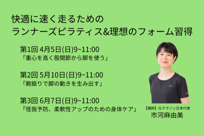 前半は、ランナーズピラティスにより柔軟性と体幹力の向上。後半はフォームの解説と実践を行います。1人ずつフォームチェックも受けられます。より具体的なテーマに沿って行う3回シリーズ。単発の参加も大歓迎です。