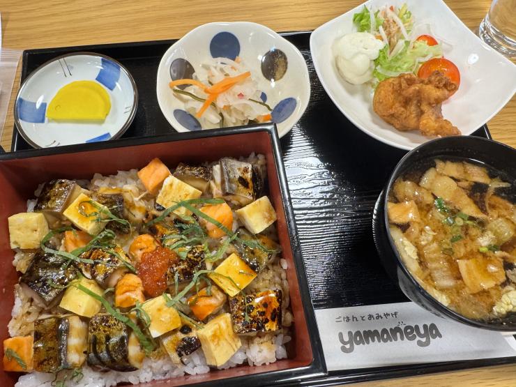 ・ゴール後の若桜駅前やまね屋さんでの昼食(焼き鯖重)