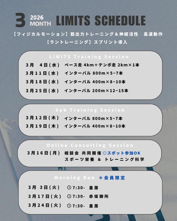 【LIMITS|身体能力開発ランクラブ】3月練習会(インターバル:サブ2:40-5:00) 受付中