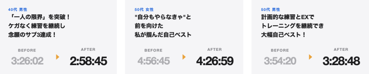 「独学では故障に悩まされていたが、適切なプログラムとエクササイズにより故障が改善。継続できたことでサブ3を達成できた。」