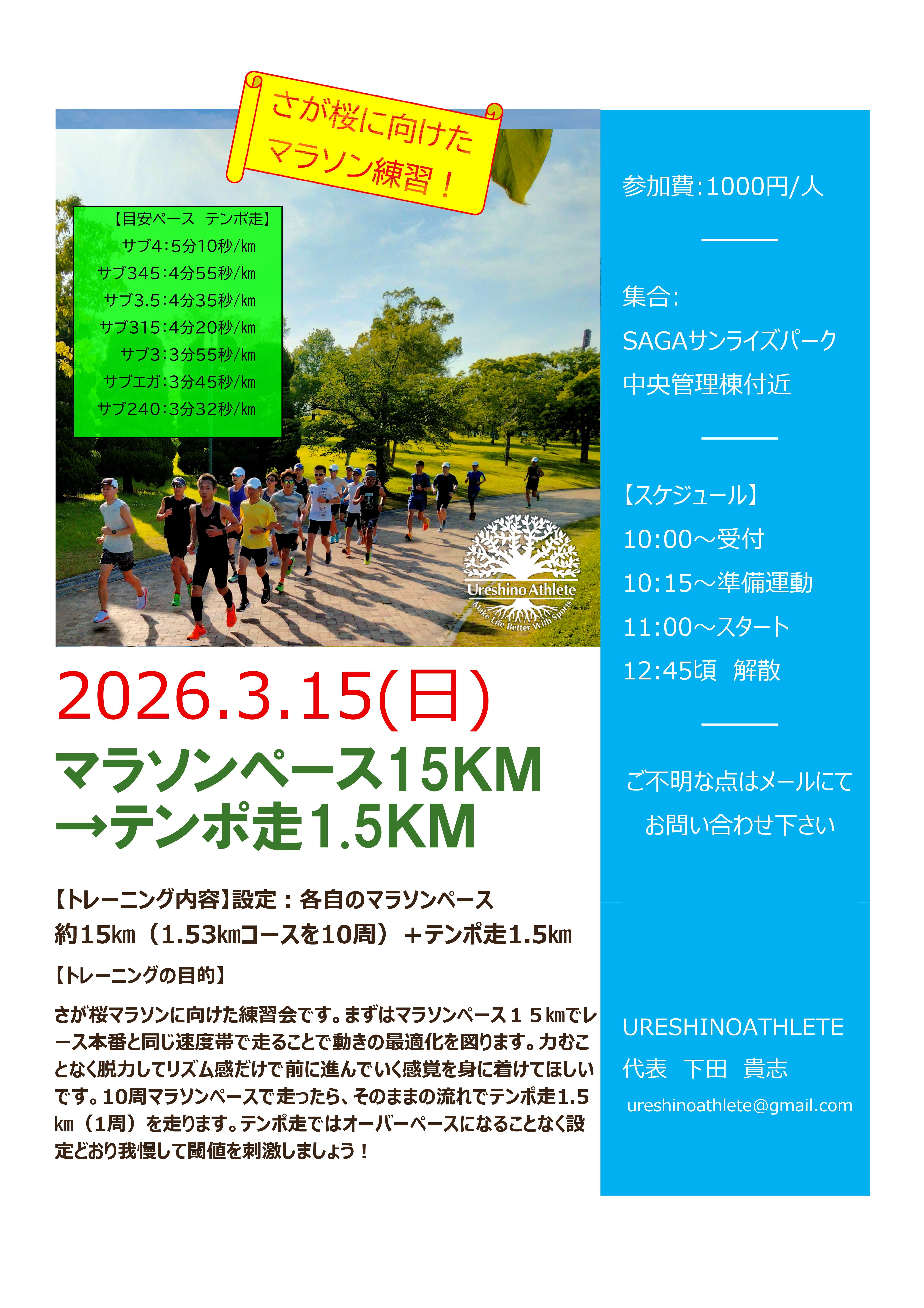 【さが桜に向けて】15kmマラソンペース→テンポ走1.5km@サンライズ 受付中