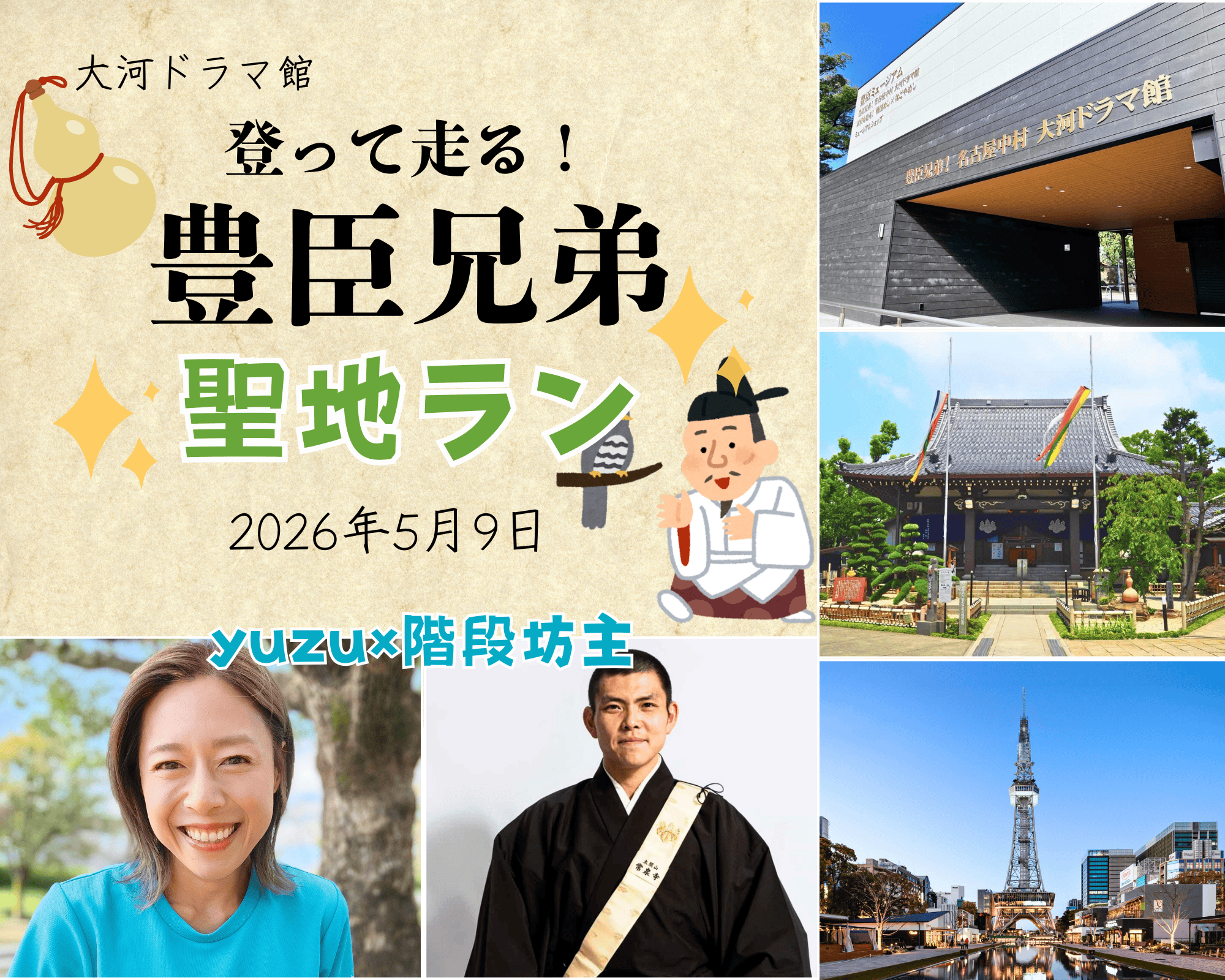豊臣秀吉公の生誕地である「常泉寺」の副住職でステアクライミングの選手<階段坊主>さんをお迎えし、名古屋のシンボル『中部電力MIRAI TOWER』を階段で登る体験や、"豊臣兄弟!”ゆかりの場所を巡ります!最後には大河ドラマ館も楽しめる!