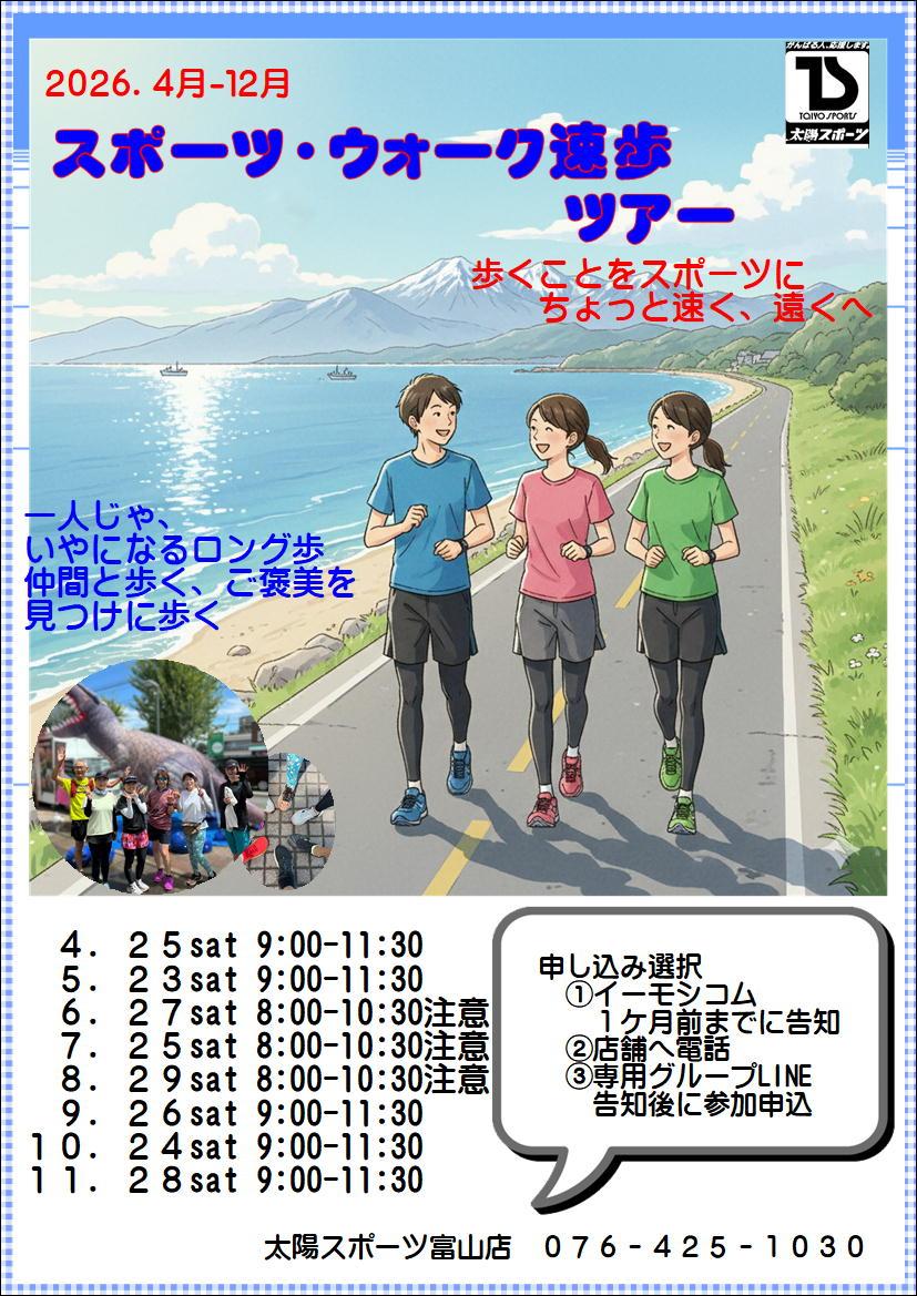 富山県内のマラソン大会に歩いて参加している講師経験者が教えます。「歩くことをスポーツに」普段の散歩より速く歩く「速歩」。