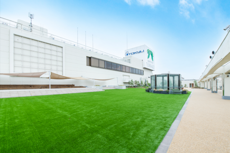 たまプラーザテラス ノースプラザ(東急百貨店)3階に広がる屋上庭園「コモンフィールド」。「街の人が家族になれる、大きな庭」をコンセプトに、芝生の開放的な空間で、親子がのびのびと体を動かせる場所です。