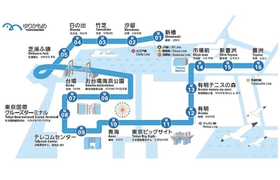 コ ー ス :新橋駅スタート!→汐留駅→竹芝駅→日の出駅→芝浦ふ頭駅→お台場海浜公園駅→東京国際クルーズターミナル駅→テレコムセンター駅→青海駅→東京ビッグサイト駅→有明駅→有明テニスの森駅→市場前駅→新豊洲駅→豊洲駅ゴール!(15kmコース)