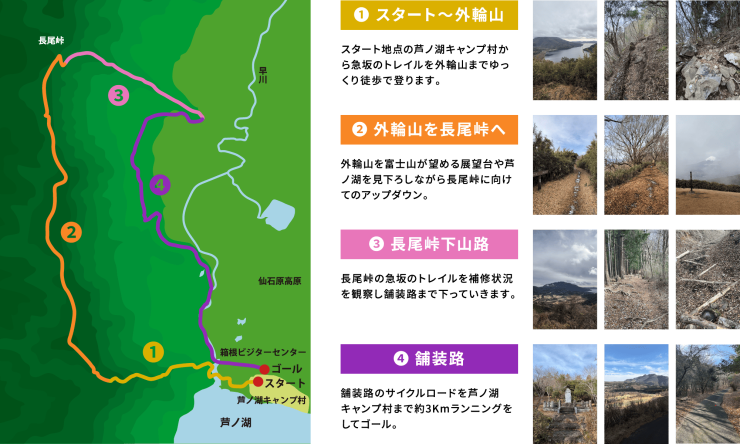 メイン会場の「芦ノ湖キャンプ村」から外輪山を経由して長尾峠まで往復し、富士山や芦ノ湖などの絶景と箱根のトレイルの美しさを体感していただける約3時間のツアーです。