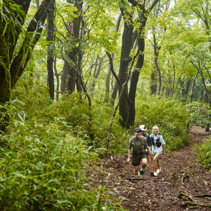 1チーム15名のグループごとに、トレイルに精通した地元箱根のガイドが帯同いたします。道中にある絶景スポットを巡りながらアップダウンが連続するトレイルを歩き、ラスト約3Kmの舗装路セクションはランニングも楽しみます。