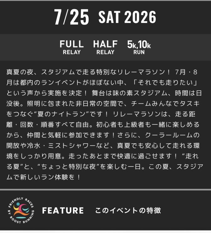 味の素スタジアムで、チームで楽しめる「リレーマラソン」を開催!リレーマラソンは走る距離、回数、順番も自由なので上級者も未経験者も一緒に走ることができます!マラソン大会オフシーズンはチームのみんなでタスキを繋いでランニングを楽しみましょう!味の素スタジアムで最高の思い出を!