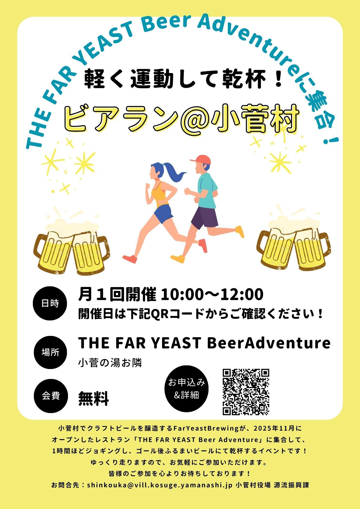 FarYeastBrewingが2025年11月13日に小菅村にオープンしたレストラン「THE FAR YEAST Beer Adventure」を起点にしたビアランイベントを開催します。レストランをスタート・ゴールに、小菅村の見どころを巡りながら1時間ほど走り、ふるまいビールで乾杯するイベントです。ビールを愛する仲間と、楽しく走って乾杯しましょう!