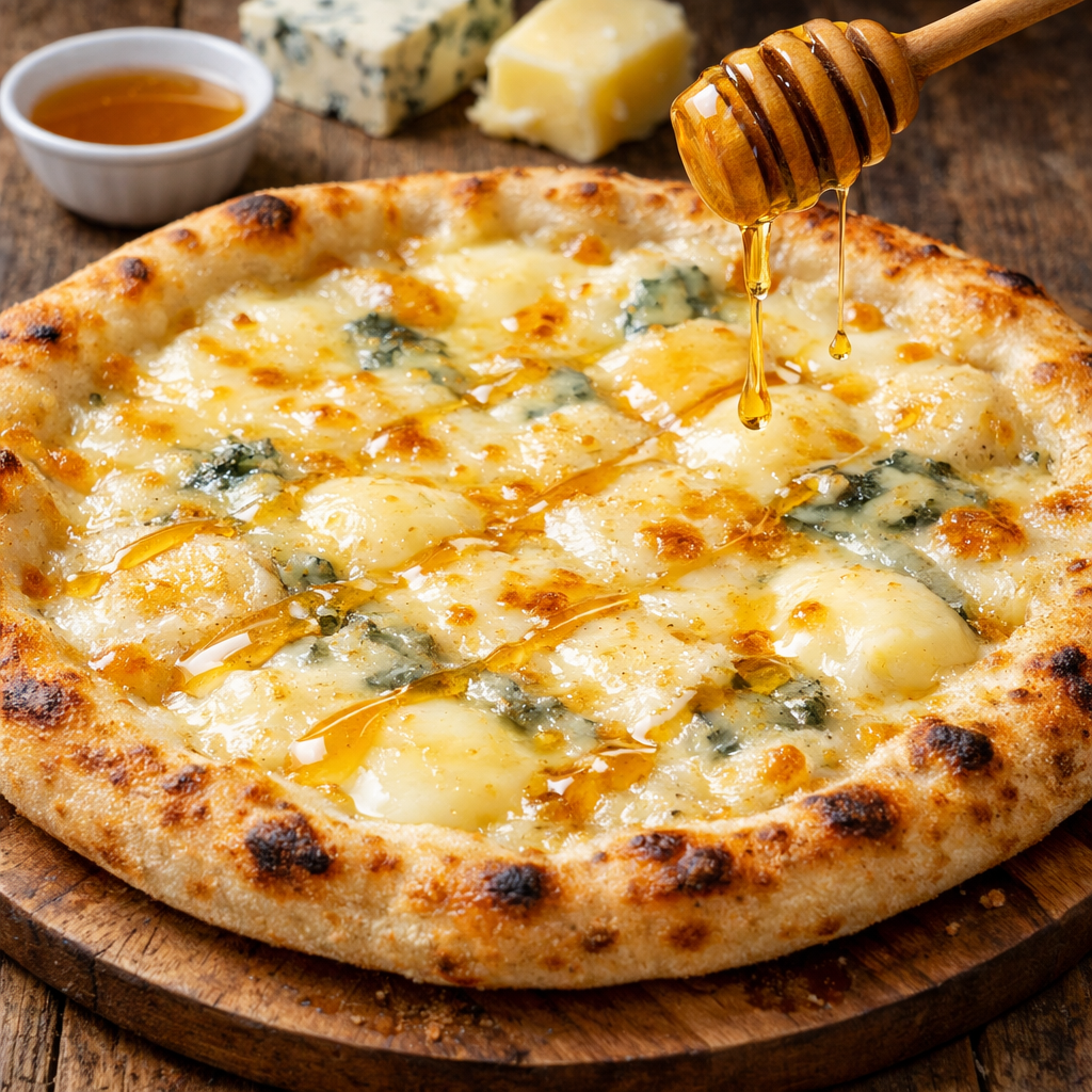 焼きたてピザに好みのはちみつをかけて味変できる、こ