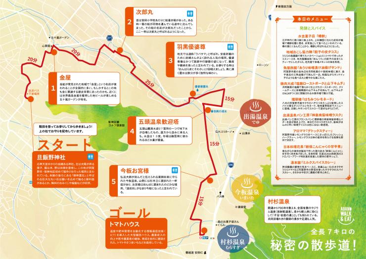 料金に含まれるもの:ウォーキング参加料、コース内の飲食、送迎バス代、保険料、参加特典(グルメ会場内、日帰り入浴(旅館)で使える500円クーポン)