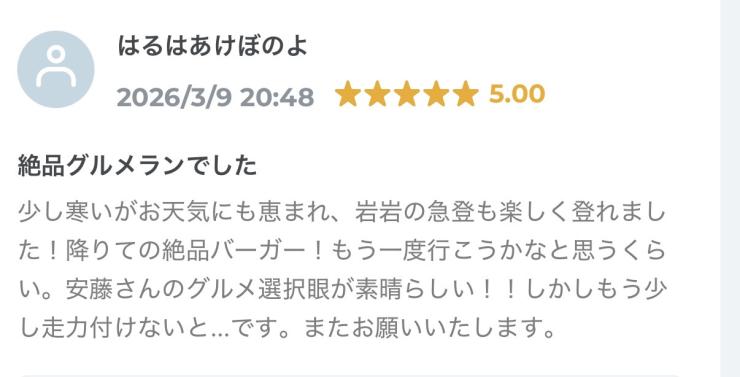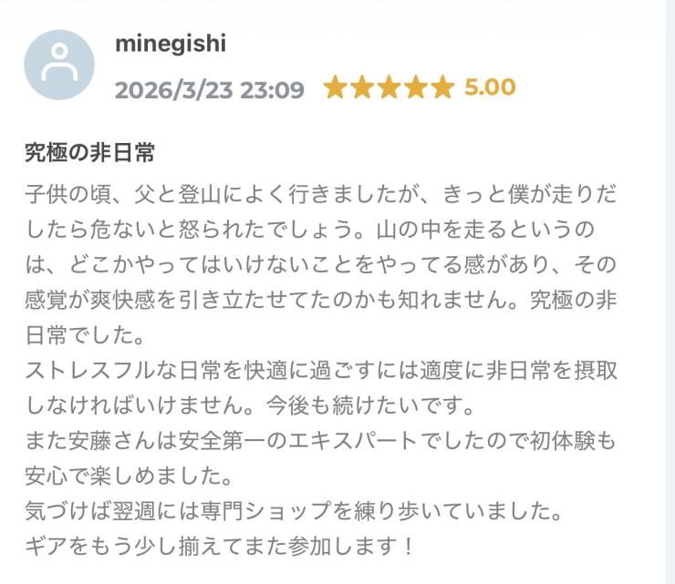 最少催行人数に満たない場合や、台風・大雨・雪など安全確保が難しい場合は中止とさせていただくことがあります。台風・大雨・雪など安全確保が難しい場合は中止とします。前日19時までにご連絡し、参加費は返金対応いたします。口コミ