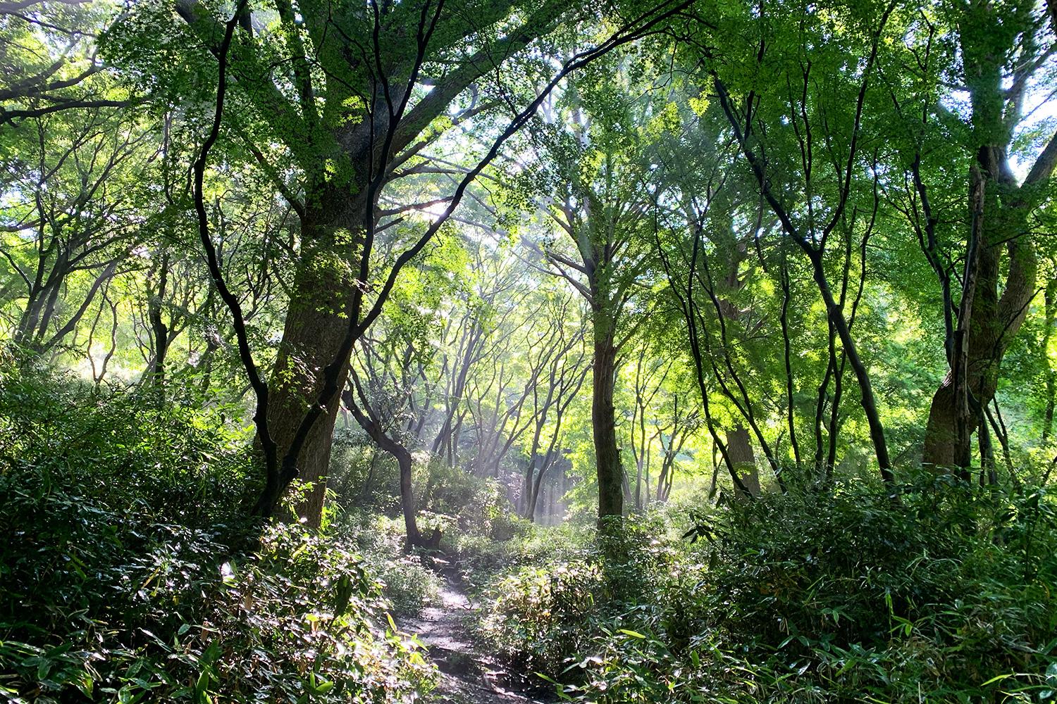 鶴岡八幡宮を抜け、静かな住宅街の先からいよいよトレイルへ。最初におとずれる「獅子舞」は、鎌倉の中でも手付かずの自然が残るエリア。足元をサラサラと流れる小川の水音と、鳥のさえずりを聞きながら、緑のトンネルをゆっくり進みます。