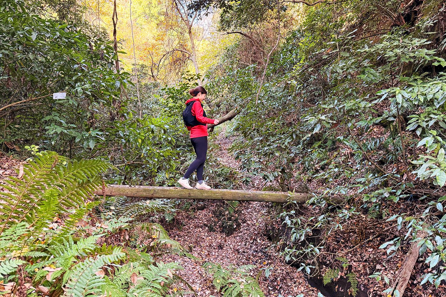 獅子舞のさらに奥、普通のハイキングコースからは少し外れた秘境へと足を進めます。バランスを取りながら丸太の一本橋を渡ったり、鮮やかな新緑の中を流れる小川を越えたり。日常では味わえないアドベンチャー気分を楽しみながら、静かな森の時間を満喫しましょう。