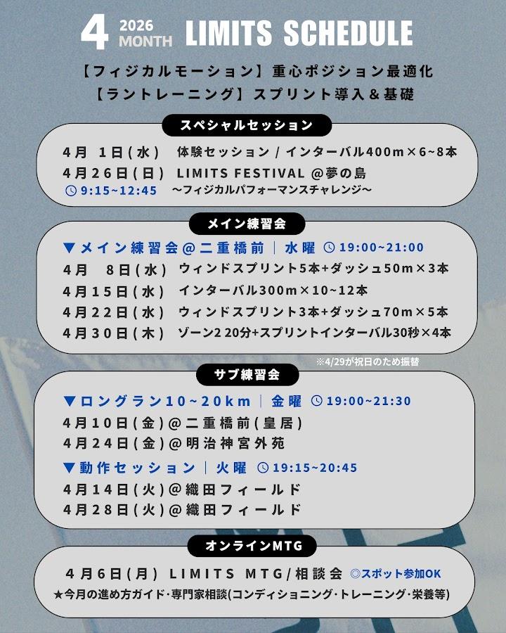 【LIMITS|身体能力開発ランクラブ】4月練習会(インターバル:サブ2:40-5:00) 受付中