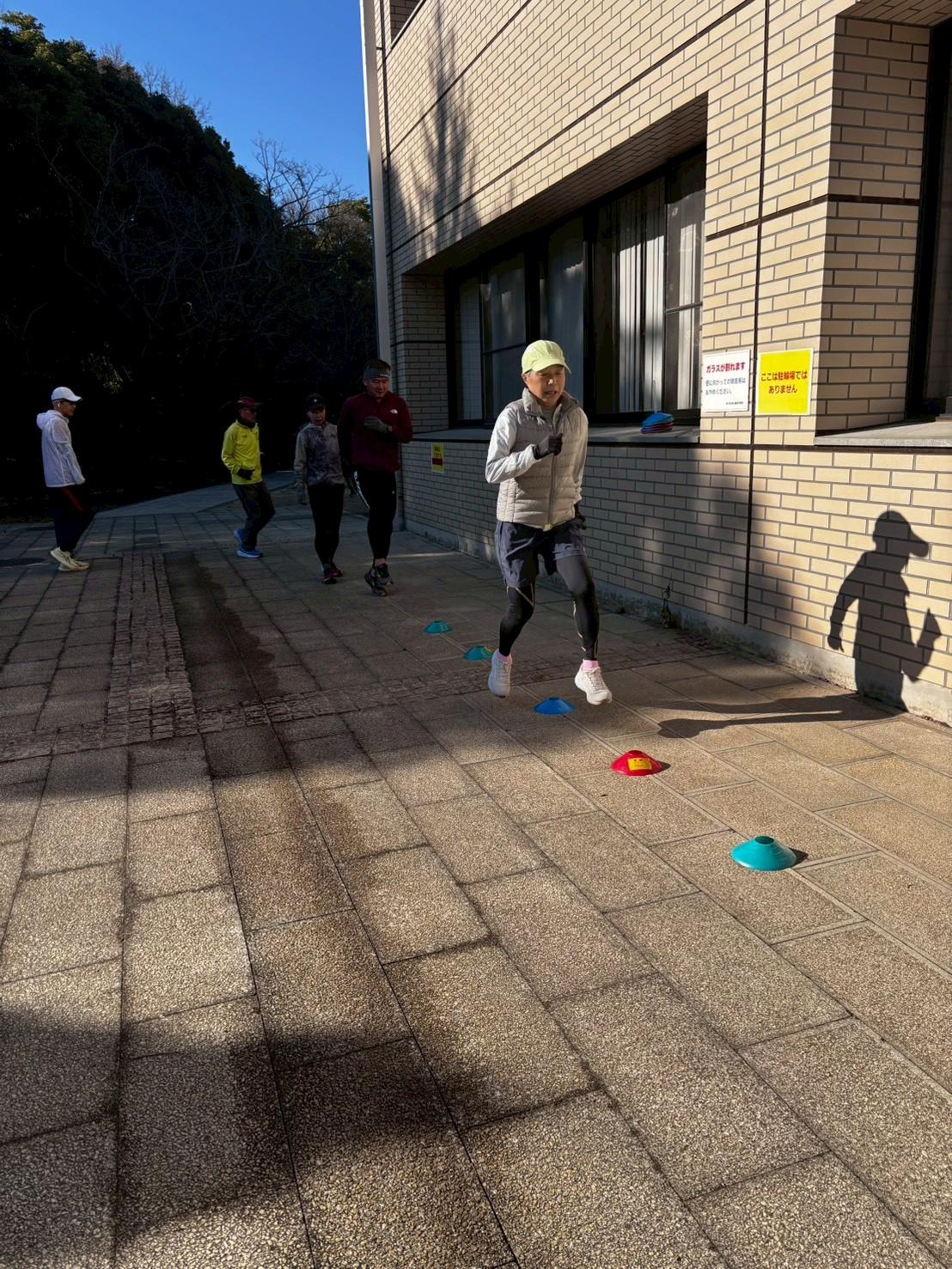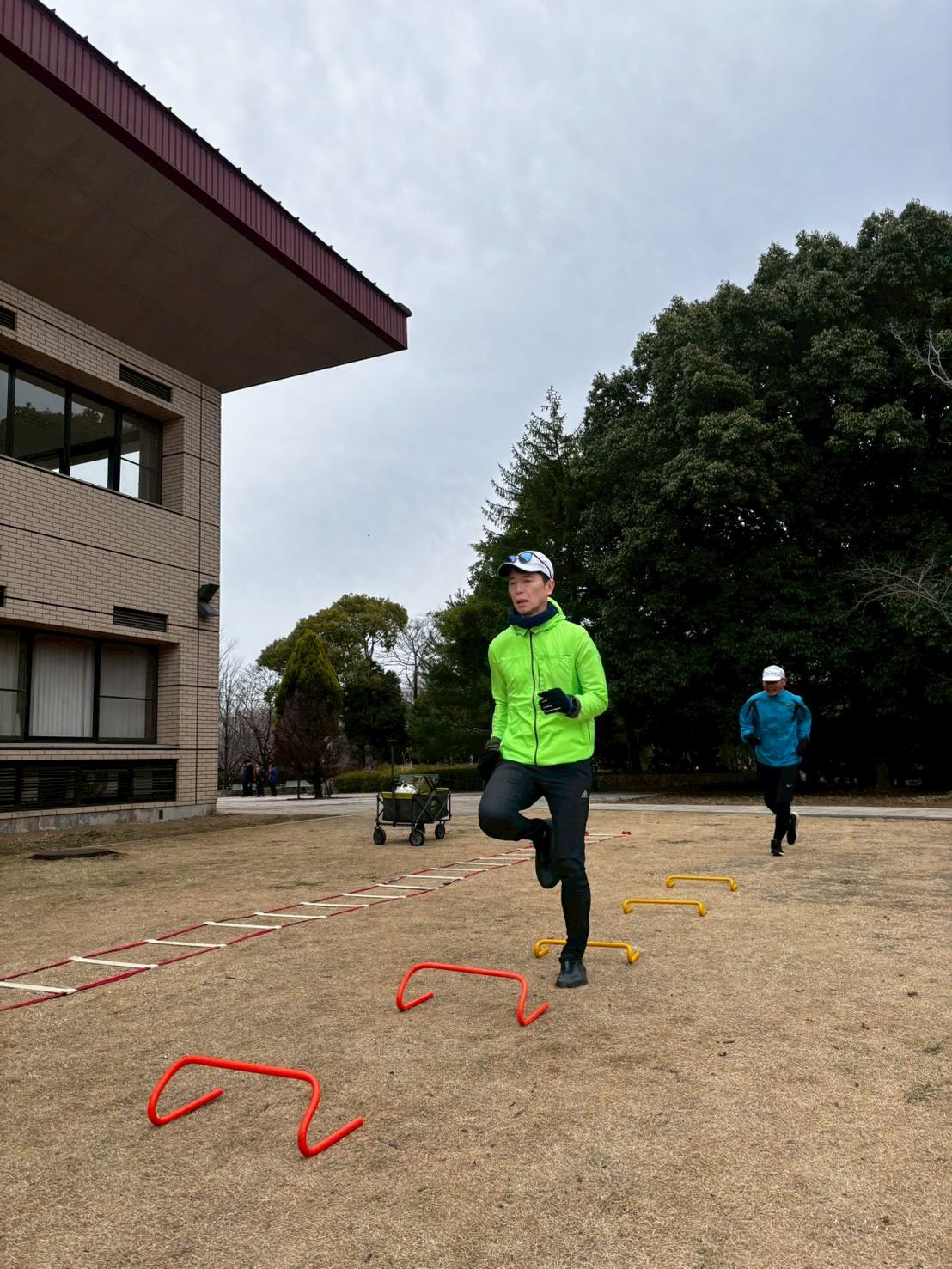 (ドリルなどアクティブに体を動かして走る前の準備を行います)