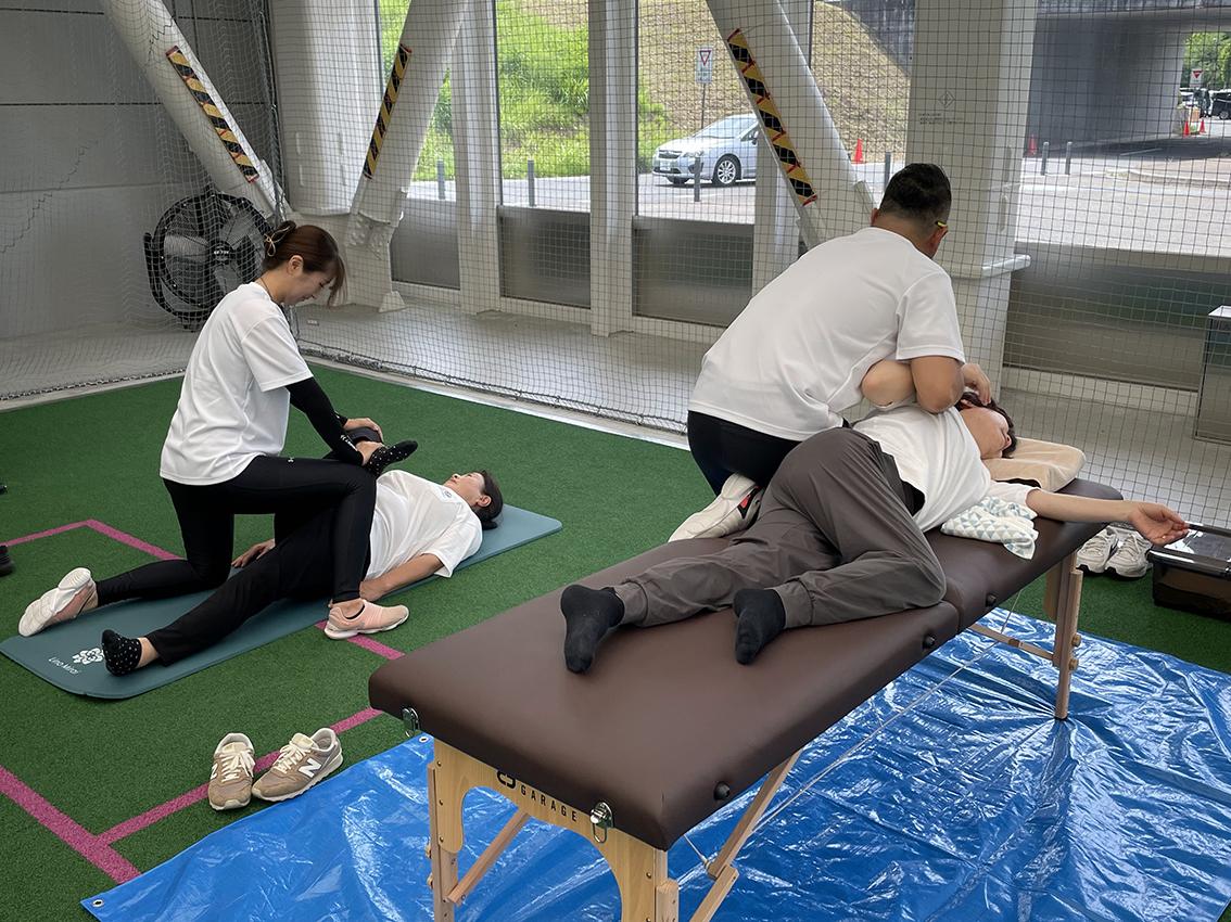 リズムトレーニングやPNFストレッチ,骨盤調整でカラダの使い方を講習。