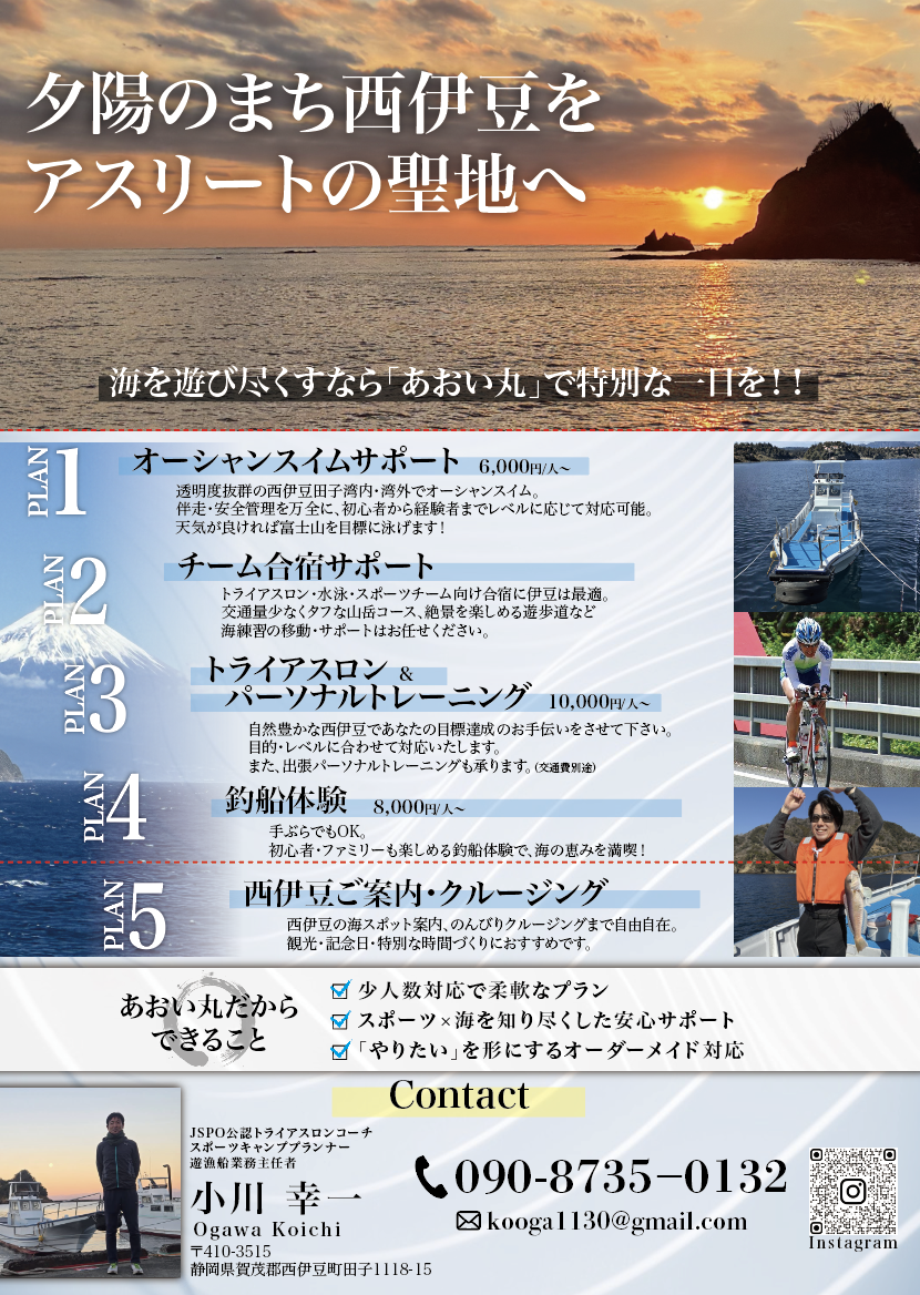 IZUをトライアスロン合宿の聖地にすることを目標に、西伊豆を拠点に、首都圏や東海地方への出張パーソナルトレーニングで大会へ向けた練習をサポート
